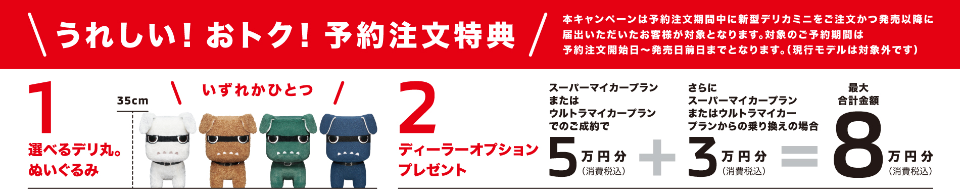 ●施策内容 : 新型デリカミニの新車をスーパーマイカープランまたはウルトラマイカープランで予約注文期間中にご成約いただいた場合、ディーラーオプション5万円分(消費税込)をプレゼント。 ●増額条件 : 現在スーパーマイカープランまたはウルトラマイカープランをご契約中の方が、新規にスーパーマイカープランまたはウルトラマイカープランで新型デリカミニの新車に乗り換えると、3万円分(消費税込)を増額し合計でディーラーオプション8万円分(消費税込)をプレゼント。 ●ディーラーオプションプレゼントの適用方法 : ディーラーオプション総額から、プレゼント金額に応じて5万円(消費税込)または8万円(消費税込)の値引きを適用いたします。取付工賃は別途必要です。 ●ディーラーオプション総額がプレゼント金額に満たない場合は、ご注文額を値引額の上限とし、返金等はありません。 ●本キャンペーンは現金との引き換えはできません。 ●メーカーオプションは対象外です。